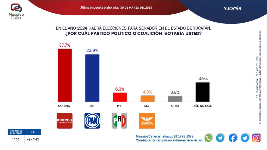 En menos de 48 horas la empresa Masive Caller dio a conocer el par sondeos que indican que el partido Movimiento Regeneración Nacional (Morena) crece de manera importante, a pesar de no tener candidato, mientras que en el PAN, el evidente inicio de campaña del alcalde Renán Barrera Concha, que sueña con 6 años más de vivir del erario, han ocasionado que la ventaja, que en teoría les da el ser gobierno local en Mérida y Yucatán, se haya convertido en un activo en contra