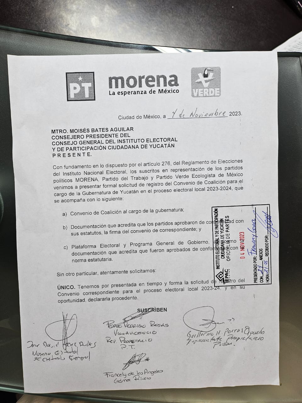 Este sábado los representantes ante el Consejo General del Iepac, Rodrigo Rosas Villavicencio del PT, Francely de los Ángeles Gómez Rivero de Morena y Guillermo Porras Quevedo del PVEM entregaron un documento dirigido al Moises Bates Aguilar presidente del Iepac donde el solicitan el registro de dicha coalición.