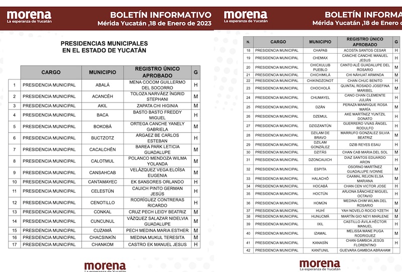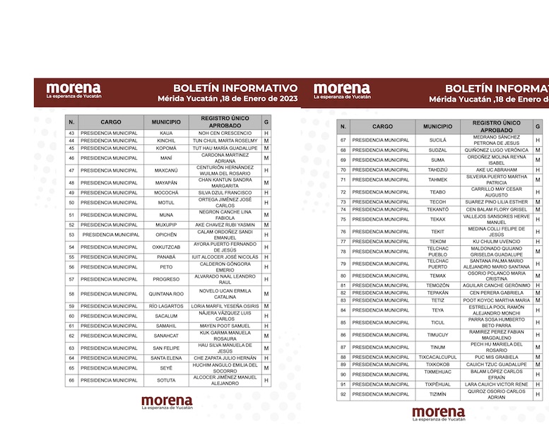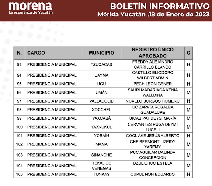 El documento fue acompañado por una lista con los 105 nombres de 54 hombres y 51 mujeres que son los registros únicos avalados por esa fuerza política para registrarse como “Defensores y Defensoras de la Cuarta Transformación” en cada uno de los ayuntamientos