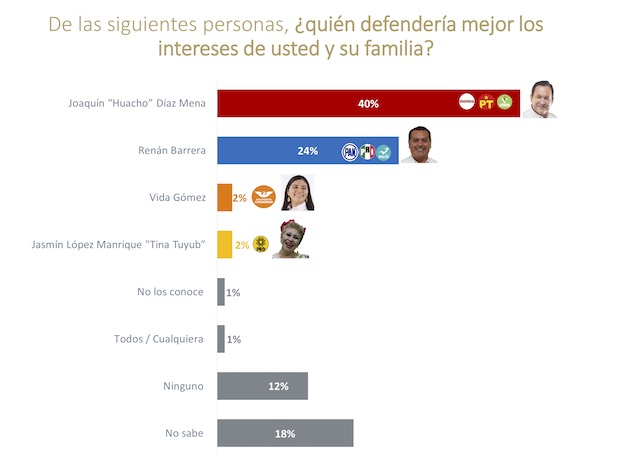 De acuerdo con la encuesta realizada entre el 14 y 17 del presente mes, el candidato de esa coalición, Joaquín Díaz Mena “Huacho”, vencería con un 41 por ciento de la votación al abanderado de los partidos PRI, PAN y PANAL R. Alberto B. Concha, quien apenas alcanzaría el 24 por ciento de las preferencias populares, le sigue Vida Gómez Herrera de Movimiento Ciudadano y Jasmin López Manrique del PRD con apenas un 1 por ciento cada una de ellas