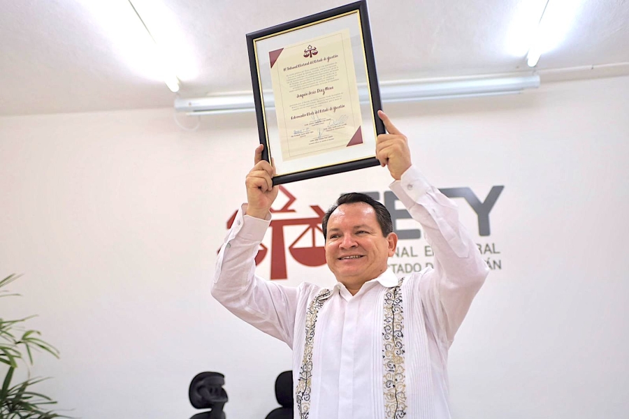 Ante la magistrada presidenta del Tribunal Electoral del Estado de Yucatán, Lissette Guadalupe Cetz Canché; el magistrado Fernando Javier Bolio Vales; la magistrada con Ministerio de Ley, Dina Noemí Loría Carrillo, Díaz Mena agradeció al TEEY la invitación al acto de recepción de la constancia, así como a quienes participaron en la jornada y a quienes con su voto lo llevaron a la gubernatura.