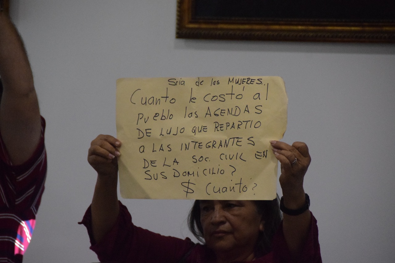 La reunión se prolongó por más de cuatro horas y media, durante la cual se presentaron algunas protestas por parte de maestros que se manifestaron por presuntas irregularidades en el reparto de plazas en la Segey y también en contra de la titular de Semujeres, María Herrera Páramo, a quien la activista Adelaida Salas Salazar, le recriminó con una cartulina la compra de “lujosas” agendas para “integrantes de la sociedad civil”.